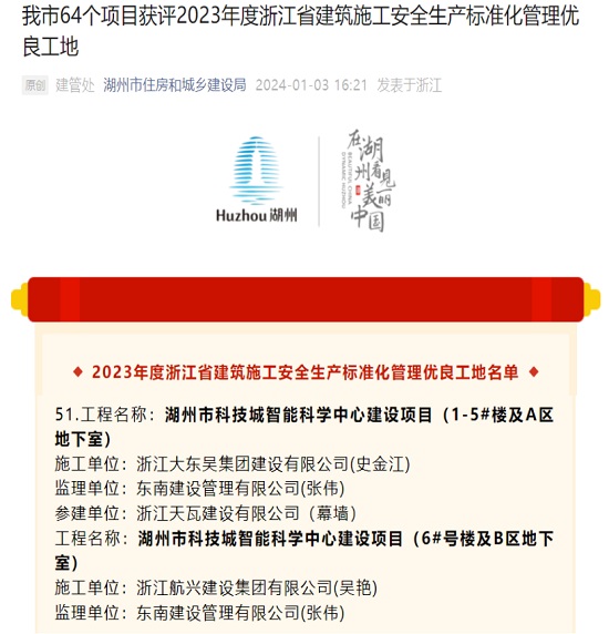 1月3日,,,,浙江省建设厅宣布《关于宣布2023年度浙江省修建施工清静生产标准化治理优良工地考评效果的通知》,,,,位于湖州南太湖新区西凤漾单位XSS-03-02-04C号地块、西凤漾单位XSS-03-02-04C-1号地块的湖州市科技城智能科学中心建设项目(壹号娱乐app官网·太湖首座)荣获“2023年度浙江省修建施工清静生产标准化治理优良工地”称呼,,,,这一声誉是对项目在清静生产标准治理方面的肯定和认可。。。